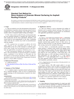 ASTM D451/D451M-17(2022) is a standard published by ASTM International. Its full title is "Standard Test Method for Sieve Analysis of Granular Mineral Surfacing for Asphalt Roofing Products". This standard covers: SIGNIFICANCE AND USE 4.1 This test method is used to determine the grading of materials used as granular mineral surfacing. The results are used to determine compliance of the particle size distribution with applicable specification requirements. SCOPE 1.1 This test method covers the determination of the particle size distribution of granular mineral surfacing material such as crushed slate, stone, coated granules, and so forth, used on the weather surface of prepared asphalt roofing and shingles. 1.2 The values stated in either SI units or inch-pound units are to be regarded separately as standard. The values stated in each system may not be exact equivalents; therefore, each system shall be used independently of the other. Combining values from the two systems may result in nonconformance with the standard. 1.3 This standard does not purport to address all of the safety concerns, if any, associated with its use. It is the responsibility of the user of this standard to establish appropriate safety, health, and environmental practices and determine the applicability of regulatory limitations prior to use. 1.4 This international standard was developed in accordance with internationally recognized principles on standardization established in the Decision on Principles for the Development of International Standards, Guides and Recommendations issued by the World Trade Organization Technical Barriers to Trade (TBT) Committee.