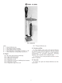 SIGNIFICANCE AND USE 5.1 This test method simulates, to a practical degree, the operation of the thermostat metal coil. 5.2 The thermal deflection properties of a coil may vary from lot-to-lot of thermostat metal material. This method is useful for determining the optimum thickness and length of the material for a given deflection specification. 5.3 This method is useful as a quality test to determine acceptance or rejection of a lot of thermostat metal coils. SCOPE 1.1 This test method covers the determination of the thermal deflection rate of spiral and helical coils of thermostat metal. 1.2 The values stated in inch-pound units are to be regarded as standard. The values given in parentheses are mathematical conversions to SI units that are provided for information only and are not considered standard. 1.3 This standard does not purport to address all of the safety concerns, if any, associated with its use. It is the responsibility of the user of this standard to become familiar with all hazards including those identified in the appropriate Safety Data Sheet (SDS) for this product/material as provided by the manufacturer, to establish appropriate safety, health, and environmental practices, and determine the applicability of regulatory limitations prior to use. 1.4 This international standard was developed in accordance with internationally recognized principles on standardization established in the Decision on Principles for the Development of International Standards, Guides and Recommendations issued by the World Trade Organization Technical Barriers to Trade (TBT) Committee.
