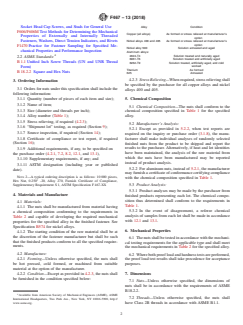 ABSTRACT This specification covers the requirements for commercial wrought nonferrous nuts in nominal thread diameters M6 to M36 inclusive in a number of alloys in common use and intended for general service applications. Materials shall be tested and shall conform to the chemical composition, hardness, proof stress, proof load, and tensile stress requirements. SIGNIFICANCE AND USE 11.1 For purposes of determining compliance with the specified limits for requirements of the properties listed in this specification, an observed value or calculated value shall be rounded in accordance with Practice E29. SCOPE 1.1 This specification covers the requirements for commercial wrought nonferrous nuts 0.250 to 1.500 in. inclusive in diameter in a number of alloys in common use and intended for general service applications. 1.2 Applicable bolts, cap screws, and studs for use with nuts covered by this specification are covered by Specification F468. 1.3 The values stated in inch-pound units are to be regarded as standard. No other units of measurement are included in this standard. Note 1: This specification is the inch-pound companion to Specification F467M; therefore, no SI equivalents are presented in the specification. 1.4 This international standard was developed in accordance with internationally recognized principles on standardization established in the Decision on Principles for the Development of International Standards, Guides and Recommendations issued by the World Trade Organization Technical Barriers to Trade (TBT) Committee.