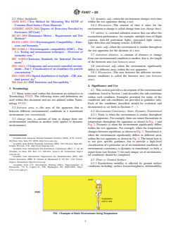 SIGNIFICANCE AND USE 4.1 This section provides a description of the environmental conditions listed in Section 1 and describes the sub-conditions within each condition. Examples provided for many of the conditions and sub-conditions are provided as guidance only. Each of the conditions described should be evaluated and documented as set forth in Sections 5 – 7. 4.2 Environment Consistency: Static, Dynamic, Transitional 4.2.1 Static is when the environment is similar throughout the test apparatus. For example, there are minor fluctuations in temperature throughout the apparatus as shown in Fig. 1 and Fig. 2. Dynamic is when the environment significantly differs within the test apparatus. For example, when the temperature changes between repetitions as shown in Fig. 3. Transitional is when the environment significantly differs in different areas within the test apparatus as shown in Fig. 4. The intent here is to not give specific guidance, but to provide a high-level classification of a particular set of environmental conditions. If environment consistency is dynamic or transitional, or both, a report form (see Section 7) for each unique set of environmental conditions should be completed. FIG. 1 Example of Static Environment Using Temperature FIG. 2 Example of Static Environment Using Temperature and Showing a Transition Between Two Static Environments FIG. 3 Example of Dynamic Environment Using Temperature and Showing that the Environment Changed During the Test FIG. 4 Example of Transitional Environment Using Temperature Portions of the Environment may Remain Static or may be Dynamic (For example, Cold to Colder) 4.3 Floor or Ground Surface: 4.3.1 Exoskeleton mobility is affected by ground surface conditions including: surface texture/roughness, deformability, slope or lack of flatness (that is, undulation). Ground surface conditions can affect the exoskeleton: traction, vibration affecting the electronics integrity, positioning, and stability. 4.3.2 Type(s): ... SCOPE 1.1 When conducting test methods, it is important to consider the role that the environmental conditions play in measurement of exoskeleton safety and performance. Exoskeletons are designed to be operated both indoors and outdoors under conditions specified by the manufacturer. Likewise, end users of the exoskeletons will be using these exoskeletons in a variety of environmental conditions. When conducting and replicating ASTM Committee F48 test methods by exoskeleton manufacturers and users, it is important to specify and document the environmental conditions under which the exoskeleton is to be tested as there will be variations in system performance caused by the conditions, especially when comparing and replicating sets of test results. It is also important to consider changes in environmental conditions during the course of operations (for example, transitions between conditions). As such, environmental conditions specified in this document are static, dynamic, or transitional, or combinations thereof; with the exoskeleton stationary or in motion. This document provides brief introduction to the following list of environmental conditions that can affect performance of the exoskeleton: 1.1.1 Floor or ground surface; 1.1.2 Temperature; 1.1.3 Humidity; 1.1.4 Atmospheric pressure; 1.1.5 Lighting; 1.1.6 Air flow and quality; 1.1.7 External sensor emission; 1.1.8 Electrical interference; 1.1.9 Boundaries; 1.1.10 Additional categories, for example underwater, extraterrestrial, may also be added to this standard as the exoskeleton industry applications evolve in these areas. 1.1.11 This document then breaks down each condition into sub-categories so that the user can document the various aspects associated with the category prior to exoskeleton tests defined in ASTM Committee F48 test methods listed in Section 2. It is recommended that salient environment conditions be documented when conduc...