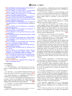 SIGNIFICANCE AND USE 5.1 The compatibility of greases can be important for users of grease-lubricated equipment. It is well known that the mixing of two greases can produce a substance markedly inferior to either of its constituent materials. One or more of the following can occur. A mixture of incompatible greases most often softens, sometimes excessively. Occasionally, it can harden. In extreme cases, the thickener and liquid lubricant will completely separate. Bleeding can be so severe that the mixed grease will run out of an operating bearing. Excessive syneresis can occur, forming pools of liquid lubricant separated from the grease. Dropping points can be reduced to the extent that grease or separated oil runs out of bearings at elevated operating temperatures. Such events can lead to catastrophic lubrication failures. 5.1.1 Because of such occurrences, equipment manufacturers recommend completely cleaning the grease from equipment before installing a different grease. Service recommendations for grease-lubricated equipment frequently specify the caveat–do not mix greases under any circumstances. Despite this admonition, grease mixing will occur and, at times, cannot be avoided. In such instances, it would be useful to know whether the mixing of two greases could lead to inadequate lubrication with disastrous consequences. Equipment users most often do not have the resources to evaluate grease compatibility and must rely on their suppliers. Mixing of greases is a highly imprudent practice. Grease and equipment manufacturers alike recognize such practices will occur despite all warnings to the contrary. Thus, both users and suppliers have a need to know the compatibility characteristics of the greases in question. 5.2 There are two approaches to evaluating the compatibility of grease mixtures. One is to determine whether such mixtures meet the same specification requirements as the constituent components. This approach is not addressed by this practice. Instead, this practice... SCOPE 1.1 This practice covers a protocol for evaluating the compatibility of one or three binary mixtures of lubricating greases by comparing their properties or performance relative to those of the neat greases comprising the mixture. 1.2 Three properties are evaluated in a primary testing protocol using standard test methods: (1) dropping point by Test Method D566 (or Test Method D2265); (2) shear stability by Test Methods D217, 100 000–stroke worked penetration; and (3) storage stability at elevated-temperature by change in 60-stroke penetration (Test Method D217). For compatible mixtures (those passing all primary testing), a secondary (nonmandatory) testing scheme is suggested when circumstances indicate the need for additional testing. 1.3 Sequential or concurrent testing is continued until the first failure. If any mixture fails any of the primary tests, the greases are incompatible. If all mixtures pass the three primary tests, the greases are considered compatible. 1.4 This practice applies only to lubricating greases having characteristics suitable for evaluation by the suggested test methods. If the scope of a specific test method limits testing to those greases within a specified range of properties, greases outside that range cannot be tested for compatibility by that test method. An exception to this would be when the tested property of the neat, constituent greases is within the specified range, but the tested property of a mixture is outside the range because of incompatibility. 1.5 This practice does not purport to cover all test methods that could be employed. 1.6 The values stated in SI units are to be regarded as standard. No other units of measurement are included in this standard. 1.7 This standard does not purport to address all of the safety concerns, if any, associated with its use. It is the responsibility of the user of this standard to establish appropriate safety, health, and env...