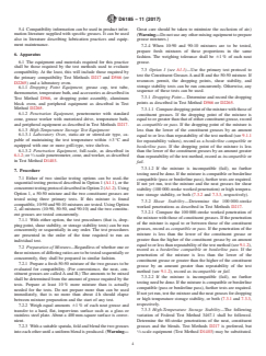 5.2 There are two approaches to evaluating the compatibility of grease mixtures. One is to determine whether such mixtures meet the same specification requirements as the constituent components. This approach is not addressed by this practice. Instead, this practice...