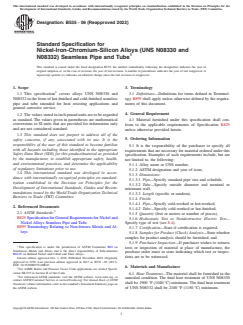 ABSTRACT This specification covers alloys UNS N08330 and N08332 in the form of hot-finished and cold-finished seamless pipe and tube intended for heat resisting applications and general corrosive service. The material shall be furnished in the annealed condition. The alloys shall conform to the composition limits of the material of this specification. Tensile strength, yield strength, elongation, and hardness of the material shall conform to the mechanical property requirements. Annealed alloy UNS N08332 shall conform to an average grain size set by this specification, or coarser. One test per lot is required. Flattening test shall also be performed. Each pipe or tube shall be subjected to either the hydrostatic test or to a nondestructive electric test. SCOPE 1.1 This specification2 covers alloys UNS N08330 and N08332 in the form of hot-finished and cold-finished seamless pipe and tube intended for heat resisting applications and general corrosive service. 1.2 The values stated in inch-pound units are to be regarded as standard. The values given in parentheses are mathematical conversions to SI units that are provided for information only and are not considered standard. 1.3 This standard does not purport to address all of the safety concerns, if any, associated with its use. It is the responsibility of the user of this standard to become familiar with all hazards including those identified in the appropriate Safety Data Sheet (SDS) for this product/material as provided by the manufacturer, to establish appropriate safety, health, and environmental practices, and determine the applicability of regulatory limitations prior to use. 1.4 This international standard was developed in accordance with internationally recognized principles on standardization established in the Decision on Principles for the Development of International Standards, Guides and Recommendations issued by the World Trade Organization Technical Barriers to Trade (TBT) Committee.