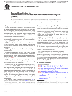 ASTM D7194-19(2024): Standard Specification for Aerospace Parts Machined from Polychlorotrifluoroethylene (PCTFE) sets the requirements for aerospace-grade components fabricated from virgin, unplasticized, pure PCTFE homopolymer. This standard ensures high performance, safety, dimensional stability, and reliability in demanding aerospace systems. It excludes parts made from PCTFE copolymers, film, tape, modified versions, or recycled materials, focusing strictly on homopolymer-based, machined parts.