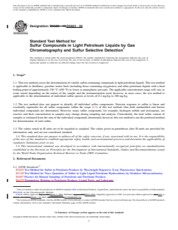 SIGNIFICANCE AND USE 5.1 Gas chromatography with sulfur selective detection provides a rapid means to identify and quantify sulfur compounds in various petroleum feeds and products. Often these materials contain varying amounts and types of sulfur compounds. Many sulfur compounds are odorous, corrosive to equipment, and inhibit or destroy catalysts employed in downstream processing. The ability to speciate sulfur compounds in various petroleum liquids is useful in controlling sulfur compounds in finished products and is frequently more important than knowledge of the total sulfur content alone. SCOPE 1.1 This test method covers the determination of volatile sulfur-containing compounds in light petroleum liquids. This test method is applicable to distillates, gasoline motor fuels (including those containing oxygenates) and other petroleum liquids with a final boiling point of approximately 230 °C (450 °F) or lower at atmospheric pressure. The applicable concentration range will vary to some extent depending on the nature of the sample and the instrumentation used; however, in most cases, the test method is applicable to the determination of individual sulfur species at levels of 0.1 mg/kg to 100 mg/kg. 1.2 The test method does not purport to identify all individual sulfur components. Detector response to sulfur is linear and essentially equimolar for all sulfur compounds within the scope (1.1) of this test method; thus both unidentified and known individual compounds are determined. However, many sulfur compounds, for example, hydrogen sulfide and mercaptans, are reactive and their concentration in samples may change during sampling and analysis. Coincidently, the total sulfur content of samples is estimated from the sum of the individual compounds determined; however, this test method is not the preferred method for determination of total sulfur. 1.3 The values stated in SI units are to be regarded as standard. The values given in parentheses after SI units are provided for information only and are not considered standard. 1.4 This standard does not purport to address all of the safety concerns, if any, associated with its use. It is the responsibility of the user of this standard to establish appropriate safety, health, and environmental practices and determine the applicability of regulatory limitations prior to use. 1.5 This international standard was developed in accordance with internationally recognized principles on standardization established in the Decision on Principles for the Development of International Standards, Guides and Recommendations issued by the World Trade Organization Technical Barriers to Trade (TBT) Committee.