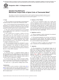 ASTM B362-91(2020) is a standard published by ASTM International. Its full title is "Standard Test Method for Mechanical Torque Rate of Spiral Coils of Thermostat Metal". This standard covers: SIGNIFICANCE AND USE 4.1 This test method is useful to determine the mechanical force of spiral coils of thermostat metal. 4.2 The mechanical properties of a coil may vary from lot to lot of thermostat metal material. This method is useful for determining the optimum thickness and length of the material for a given mechanical torque specification. 4.3 This test is useful as a quality test to determine acceptance or rejection of a lot of thermostat metal coils. SCOPE 1.1 The test method covers the principles of determining the mechanical torque rate of spiral coils of thermostat metal. Note 1: This test method has been developed particularly to cover the determination of the mechanical torque rate of spiral coils made of thermostat metal for carburetors and manifold heat controls. The method is not limited to thermostat metals and can be used for spiral coils of other materials for which the torque rate must be measured accurately. 1.2 The values stated in inch-pound units are to be regarded as the standard. The metric equivalents of inch-pound units may be approximate. 1.3 This standard does not purport to address all of the safety concerns, if any, associated with its use. It is the responsibility of the user of this standard to become familiar with all hazards including those identified in the appropriate Safety Data Sheet (SDS) for this product/material as provided by the manufacturer, to establish appropriate safety, health, and environmental practices, and determine the applicability of regulatory limitations prior to use. 1.4 This international standard was developed in accordance with internationally recognized principles on standardization established in the Decision on Principles for the Development of International Standards, Guides and Recommendations issued by the World Trade Organization Technical Barriers to Trade (TBT) Committee.
