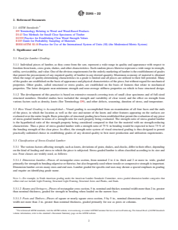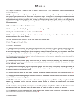 SIGNIFICANCE AND USE 3.1 Need for Lumber Grading: 3.1.1 Individual pieces of lumber, as they come from the saw, represent a wide range in quality and appearance with respect to freedom from knots, cross grain, shakes, and other characteristics. Such random pieces likewise represent a wide range in strength, utility, serviceability, and value. One of the obvious requirements for the orderly marketing of lumber is the establishment of grades that permit the procurement of any required quality of lumber in any desired quantity. Maximum economy of material is obtained when the range of quality-determining characteristics in a grade is limited and all pieces are utilized to their full potential. Many of the grades are established on the basis of appearance and physical characteristics of the piece, but without regard for mechanical properties. Other grades, called structural or stress grades, are established on the basis of features that relate to mechanical properties. The latter designate near-minimum strength and near-average stiffness properties on which to base structural design. 3.1.2 The development of this practice is based on extensive research covering tests of small clear specimens and of full-sized structural members. Detailed studies have included the strength and variability of clear wood, and the effect on strength from various factors such as density, knots (See Terminology D9), and other defects, seasoning, duration of stress, and temperature. 3.2 How Visual Grading is Accomplished—Visual grading is accomplished from an examination of all four faces and the ends of the piece, in which the location as well as the size and nature of the knots and other features appearing on the surfaces are evaluated over the entire length. Basic principles of structural grading have been established that permit the evaluation of any piece of stress-graded lumber in terms of a strength ratio for each property being evaluated. The strength ratio of stress-graded lumber is the hypothet... SCOPE 1.1 This practice (1, 2)2 covers the basic principles for establishing related unit stresses and stiffness values for design with visually-graded solid sawn structural lumber. This practice starts with property values from clear wood specimens and includes necessary procedures for the formulation of structural grades of any desired strength ratio. 1.2 The grading provisions used as illustrations herein are not intended to establish grades for purchase, but rather to show how stress-grading principles are applied. Detailed grading rules for commercial stress grades which serve as purchase specifications are established and published by agencies which formulate and maintain such rules and operate inspection facilities covering the various species. 1.3 The material covered in this practice appears in the following order: Section Scope 1 Significance and Use 3 Basic Principles of Strength Ratios 4 Estimation and Limitation of Growth Characteristics 5 Allowable Properties for Timber Design 6 Modification of Allowable Properties for Design Use 7 Example of Stress-Grade Development 8 1.4 The values stated in inch-pound units are to be regarded as standard. The values given in parentheses are mathematical conversions to SI units that are provided for information only and are not considered standard. 1.5 This standard does not purport to address all of the safety concerns, if any, associated with its use. It is the responsibility of the user of this standard to establish appropriate safety, health, and environmental practices and determine the applicability of regulatory limitations prior to use. 1.6 This international standard was developed in accordance with internationally recognized principles on standardization established in the Decision on Principles for the Development of International Standards, Guides and Recommendations issued by the World Trad...