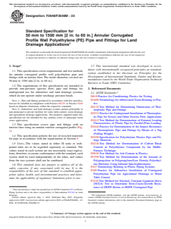 ASTM F2648/F2648M-23 is a technical specification published by ASTM International. Its full title is "Standard Specification for 50 mm to 1500 mm [2 in. to 60 in.] Annular Corrugated Profile Wall Polyethylene (PE) Pipe and Fittings for Land Drainage Applications". This standard covers: ABSTRACT This specification covers the general requirements and corresponding test methods for non-pressure (gravity flow) polyethylene (PE) pipes and fittings having interior liner with annular corrugated exterior wall profile, and whose inside diameters are 2 to 60 in. [50 to 1500 mm]. These pipes and fittings are suitable for underground use in subsurface and land drainage systems, which do not operate under surcharge pressure heads. Material requirements are specified for pipe and blow molded fittings, rotationally molded fittings and couplings, injection molded fittings and couplings, and rework materials. The resulting products shall be tested as appropriate, and shall conform to specified requirements for workmanship, dimension (inside diameter, length, minimum inner liner thickness, and perforations), stiffness, flattening resistance, impact resistance, and slow crack growth resistance of PE plastics without pigment. SCOPE 1.1 This specification covers requirements and test methods for annular corrugated profile wall polyethylene pipe and fittings with an interior liner. The inside diameters covered are 50 mm to 1500 mm [2 in. to 60 in.]. 1.2 The requirements of this specification are intended to provide non-pressure (gravity flow) pipe and fittings for underground use for subsurface and land drainage systems, which do not operate under surcharge pressure heads. Note 1: Pipe and fittings produced in accordance with this specification are be installed in compliance with Practice D2321 or Practice F449 based on diameter limitations within the respective standards. Note 2: Subsurface and land drainage systems pertain principally to non-municipal or private facilities for water table control, storm drainage and agricultural drainage applications. The products supplied under this specification are not intended for any sanitary sewer or municipal storm sewer applications. 1.3 This specification covers pipe and fittings with an interior liner using an annular exterior corrugated profile (Fig. 1). 1.4 This specification permits the use of recycled materials for pipe in accordance with the requirements in Section 5. 1.5 Units—The values stated in either SI units or inch-pound units are to be regarded separately as standard. The values stated in each system are not necessarily exact equivalents; therefore, to ensure conformance with the standard, each system shall be used independently of the other, and values from the two systems shall not be combined. 1.6 This standard does not purport to address all of the safety concerns, if any, associated with its use. It is the responsibility of the user of this standard to establish appropriate safety, health, and environmental practices and determine the applicability of regulatory limitations prior to use. 1.7 This international standard was developed in accordance with internationally recognized principles on standardization established in the Decision on Principles for the Development of International Standards, Guides and Recommendations issued by the World Trade Organization Technical Barriers to Trade (TBT) Committee.