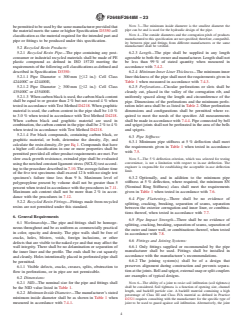 ABSTRACT This specification covers the general requirements and corresponding test methods for non-pressure (gravity flow) polyethylene (PE) pipes and fittings having interior liner with annular corrugated exterior wall profile, and whose inside diameters are 2 to 60 in. [50 to 1500 mm]. These pipes and fittings are suitable for underground use in subsurface and land drainage systems, which do not operate under surcharge pressure heads. Material requirements are specified for pipe and blow molded fittings, rotationally molded fittings and couplings, injection molded fittings and couplings, and rework materials. The resulting products shall be tested as appropriate, and shall conform to specified requirements for workmanship, dimension (inside diameter, length, minimum inner liner thickness, and perforations), stiffness, flattening resistance, impact resistance, and slow crack growth resistance of PE plastics without pigment. SCOPE 1.1 This specification covers requirements and test methods for annular corrugated profile wall polyethylene pipe and fittings with an interior liner. The inside diameters covered are 50 mm to 1500 mm [2 in. to 60 in.]. 1.2 The requirements of this specification are intended to provide non-pressure (gravity flow) pipe and fittings for underground use for subsurface and land drainage systems, which do not operate under surcharge pressure heads. Note 1: Pipe and fittings produced in accordance with this specification are be installed in compliance with Practice D2321 or Practice F449 based on diameter limitations within the respective standards. Note 2: Subsurface and land drainage systems pertain principally to non-municipal or private facilities for water table control, storm drainage and agricultural drainage applications. The products supplied under this specification are not intended for any sanitary sewer or municipal storm sewer applications. 1.3 This specification covers pipe and fittings with an interior liner using an annular exterior corrugated profile (Fig. 1). 1.4 This specification permits the use of recycled materials for pipe in accordance with the requirements in Section 5. 1.5 Units—The values stated in either SI units or inch-pound units are to be regarded separately as standard. The values stated in each system are not necessarily exact equivalents; therefore, to ensure conformance with the standard, each system shall be used independently of the other, and values from the two systems shall not be combined. 1.6 This standard does not purport to address all of the safety concerns, if any, associated with its use. It is the responsibility of the user of this standard to establish appropriate safety, health, and environmental practices and determine the applicability of regulatory limitations prior to use. 1.7 This international standard was developed in accordance with internationally recognized principles on standardization established in the Decision on Principles for the Development of International Standards, Guides and Recommendations issued by the World Trade Organization Technical Barriers to Trade (TBT) Committee.