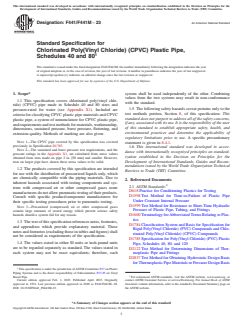 ASTM F441/F441M-23 is a technical specification published by ASTM International. Its full title is "Standard Specification for Chlorinated Poly(Vinyl Chloride) (CPVC) Plastic Pipe, Schedules 40 and 80". This standard covers: ABSTRACT This specification covers chlorinated poly(vinyl chloride) (CPVC) pipes made in Schedule 40 and 80 sizes and pressure-rated for water. These pipes are intended for use with the distribution of pressurized liquids only, which are chemically compatible with the piping materials. Included here are the criteria for classifying CPVC plastic pipe materials and CPVC plastic pipes, a system of nomenclature for CPVC plastic pipes, and requirements and test methods for materials, workmanship, dimensions, sustained pressure, burst pressure, accelerated regression, flattening resistance, and extrusion quality. SCOPE 1.1 This specification covers chlorinated poly(vinyl chloride) (CPVC) pipe made in Schedule 40 and 80 sizes and pressure-rated for water (see Appendix X1). Included are criteria for classifying CPVC plastic pipe materials and CPVC plastic pipe, a system of nomenclature for CPVC plastic pipe, and requirements and test methods for materials, workmanship, dimensions, sustained pressure, burst pressure, flattening, and extrusion quality. Methods of marking are also given. Note 1: The CPVC pipe covered by this specification was covered previously in Specification D1785. Note 2: The sustained and burst pressure test requirements, and the pressure ratings in the Appendix X1, are calculated from stress values obtained from tests made on pipe 2 in. [50 mm] and smaller. However, tests on larger pipe have shown these stress values to be valid. 1.2 The products covered by this specification are intended for use with the distribution of pressurized liquids only, which are chemically compatible with the piping materials. Due to inherent hazards associated with testing components and systems with compressed air or other compressed gases some manufacturers do not allow pneumatic testing of their products. Consult with specific product/component manufacturers for their specific testing procedures prior to pneumatic testing. Note 3: Pressurized (compressed) air or other compressed gases contain large amounts of stored energy which present serious safety hazards should a system fail for any reason. 1.3 The text of this specification references notes, footnotes, and appendixes which provide explanatory material. These notes and footnotes (excluding those in tables and figures) shall not be considered as requirements of the specification. 1.4 The values stated in either SI units or inch-pound units are to be regarded separately as standard. The values stated in each system may not be exact equivalents; therefore, each system shall be used independently of the other. Combining values from the two systems may result in non-conformance with the standard. 1.5 The following safety hazards caveat pertains only to the test methods portion, Section 8, of this specification: This standard does not purport to address all of the safety concerns, if any, associated with its use. It is the responsibility of the user of this standard to establish appropriate safety, health, and environmental practices and determine the applicability of regulatory limitations prior to use. A specific precautionary statement is given in 8.4.1. 1.6 This international standard was developed in accordance with internationally recognized principles on standardization established in the Decision on Principles for the Development of International Standards, Guides and Recommendations issued by the World Trade Organization Technical Barriers to Trade (TBT) Committee.