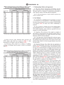 ABSTRACT This specification covers chlorinated poly(vinyl chloride) (CPVC) pipes made in Schedule 40 and 80 sizes and pressure-rated for water. These pipes are intended for use with the distribution of pressurized liquids only, which are chemically compatible with the piping materials. Included here are the criteria for classifying CPVC plastic pipe materials and CPVC plastic pipes, a system of nomenclature for CPVC plastic pipes, and requirements and test methods for materials, workmanship, dimensions, sustained pressure, burst pressure, accelerated regression, flattening resistance, and extrusion quality. SCOPE 1.1 This specification covers chlorinated poly(vinyl chloride) (CPVC) pipe made in Schedule 40 and 80 sizes and pressure-rated for water (see Appendix X1). Included are criteria for classifying CPVC plastic pipe materials and CPVC plastic pipe, a system of nomenclature for CPVC plastic pipe, and requirements and test methods for materials, workmanship, dimensions, sustained pressure, burst pressure, flattening, and extrusion quality. Methods of marking are also given. Note 1: The CPVC pipe covered by this specification was covered previously in Specification D1785. Note 2: The sustained and burst pressure test requirements, and the pressure ratings in the Appendix X1, are calculated from stress values obtained from tests made on pipe 2 in. [50 mm] and smaller. However, tests on larger pipe have shown these stress values to be valid. 1.2 The products covered by this specification are intended for use with the distribution of pressurized liquids only, which are chemically compatible with the piping materials. Due to inherent hazards associated with testing components and systems with compressed air or other compressed gases some manufacturers do not allow pneumatic testing of their products. Consult with specific product/component manufacturers for their specific testing procedures prior to pneumatic testing. Note 3: Pressurized (compressed) air or other compressed gases contain large amounts of stored energy which present serious safety hazards should a system fail for any reason. 1.3 The text of this specification references notes, footnotes, and appendixes which provide explanatory material. These notes and footnotes (excluding those in tables and figures) shall not be considered as requirements of the specification. 1.4 The values stated in either SI units or inch-pound units are to be regarded separately as standard. The values stated in each system may not be exact equivalents; therefore, each system shall be used independently of the other. Combining values from the two systems may result in non-conformance with the standard. 1.5 The following safety hazards caveat pertains only to the test methods portion, Section 8, of this specification: This standard does not purport to address all of the safety concerns, if any, associated with its use. It is the responsibility of the user of this standard to establish appropriate safety, health, and environmental practices and determine the applicability of regulatory limitations prior to use. A specific precautionary statement is given in 8.4.1. 1.6 This international standard was developed in accordance with internationally recognized principles on standardization established in the Decision on Principles for the Development of International Standards, Guides and Recommendations issued by the World Trade Organization Technical Barriers to Trade (TBT) Committee.