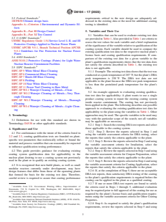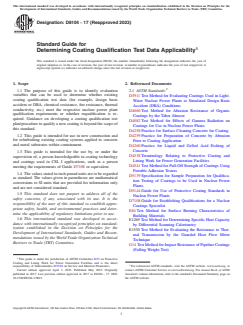 SIGNIFICANCE AND USE 4.1 For conformance with the intent of the criteria listed in 2.2 and 2.3, coating qualification tests are founded on plant-specific test parameters that realistically reflect or bound the material and process variables that can reasonably be expected to influence qualification testing performance. 4.2 This guide provides guidance for evaluating existing coating system qualification data for applicability to the nuclear plant desiring to use a coating system not previously used in the plant or to qualify an existing coating system. 4.3 It is recognized that new-build plants, as well as small modular reactors currently under development, may have design features that differ from those of the operating plants that formed the basis for the existing test data. Therefore, careful review is required to assure that coating performance requirements critical to the new design are adequately addressed in the existing data or the need for additional coating testing is identified. SCOPE 1.1 The purpose of this guide is to identify evaluation variables that can be used to determine whether existing coating qualification test data (for example, design basis accident or DBA, chemical resistance, fire resistance, thermal conductivity, etc.) meet the respective nuclear power plant qualification requirements or whether requalification is required. Guidance on developing a coating qualification test plan/procedure to qualify a new coating is beyond the scope of this standard. 1.2 This guide is intended for use in new construction and for refurbishing existing coating systems applied to concrete and metal substrates within containment. 1.3 This guide is intended for the use by, or under the supervision of, a person knowledgeable in coating technology and coatings used in CSL I applications, such as a person meeting the requirements of Guide D7108 or equivalent. 1.4 The values stated in inch-pound units are to be regarded as standard. The values given in parentheses are mathematical conversions to SI units that are provided for information only and are not considered standard. 1.5 This standard does not purport to address all of the safety concerns, if any, associated with its use. It is the responsibility of the user of this standard to establish appropriate safety, health, and environmental practices and determine the applicability of regulatory limitations prior to use. 1.6 This international standard was developed in accordance with internationally recognized principles on standardization established in the Decision on Principles for the Development of International Standards, Guides and Recommendations issued by the World Trade Organization Technical Barriers to Trade (TBT) Committee.