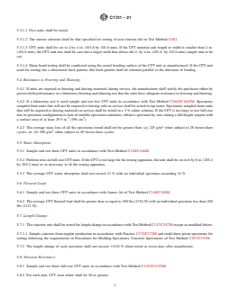 This specification establishes the product criteria and minimum performance requirements for concrete floor tile (CFT) used as interior and exterior flooring. The units described by this specification are manufactured from cementitious materials, mineral aggregates (normal weight, lightweight, or both), water, and additives that are cast into various textures and shapes, often simulating natural stone, brick, terracotta, saltillo, and others. The standard addresses materials and their manufacture, physical properties, sampling, packaging and package marking, and certification.