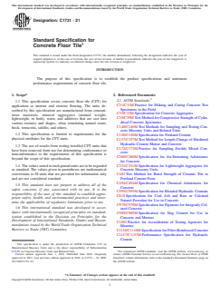 ASTM C1731-21 is a technical specification published by ASTM International. Its full title is "Standard Specification for Concrete Floor Tile". This standard covers: ABSTRACT This specification establishes the product criteria and minimum performance requirements for concrete floor tile (CFT) used as interior and exterior flooring. The units described by this specification are manufactured from cementitious materials, mineral aggregates (normal weight, lightweight, or both), water, and additives that are cast into various textures and shapes, often simulating natural stone, brick, terracotta, saltillo, and others. The standard addresses materials and their manufacture, physical properties, sampling, packaging and package marking, and certification. SCOPE 1.1 This specification covers concrete floor tile (CFT) for application as interior and exterior flooring. The units described by this specification are manufactured from cementitious materials, mineral aggregates (normal weight, lightweight, or both), water, and additives that are cast into various textures and shapes, often simulating natural stone, brick, terracotta, saltillo, and others. 1.2 This specification is limited to requirements for the physical attributes for the CFT units. 1.3 The use of results from testing installed CFT units that have been removed from use for determining conformance or nonconformance to the requirements of this specification is beyond the scope of this specification. 1.4 The values stated in inch-pound units are to be regarded as standard. The values given in parentheses are mathematical conversions to SI units that are provided for information only and are not considered standard. 1.5 This standard does not purport to address all of the safety concerns, if any, associated with its use. It is the responsibility of the user of this standard to establish appropriate safety and health practices and determine the applicability of regulatory limitations prior to use. 1.6 This international standard was developed in accordance with internationally recognized principles on standardization established in the Decision on Principles for the Development of International Standards, Guides and Recommendations issued by the World Trade Organization Technical Barriers to Trade (TBT) Committee.