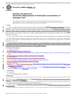 SIGNIFICANCE AND USE 5.1 Low operating temperature fuel cells such as proton exchange membrane fuel cells (PEMFCs) require high purity hydrogen for maximum material performance and lifetime. Measurement of particulates in hydrogen is necessary for assuring a feed gas of sufficient purity to satisfy fuel cell and internal combustion system needs as defined in SAE J2719. The particulates in hydrogen fuel for fuel cell vehicles (FCV) and gaseous hydrogen powered internal combustion engine vehicles may adversely affect pneumatic control components, such as valves, or other critical system components. Therefore, the concentration of particulates in the hydrogen fuel should be limited as specified by ISO 14687-2, SAE J2719, or other hydrogen fuel quality specifications. 5.2 Although not intended for application to gases other than hydrogen fuel, techniques within this test method can be applied to gas samples requiring determination of particulate concentration. SCOPE 1.1 This test method is primarily intended for gravimetric determination of particulate concentration in hydrogen intended as a fuel for fuel cell or internal combustion engine powered vehicles. This test method describes operating and quality control procedures required to obtain data of known quality satisfying the requirements of SAE J2719. This test method can be applied to other gaseous samples requiring determination of particulates provided the user’s data quality objectives are satisfied. 1.2 The values stated in SI units are to be regarded as standard. No other units of measurement are included in this standard. 1.3 This standard does not purport to address all of the safety concerns, if any, associated with its use. It is the responsibility of the user of this standard to establish appropriate safety and health practices and determine the applicability of regulatory limitations prior to use. 1.4 This international standard was developed in accordance with internationally recognized principles on standardization established in the Decision on Principles for the Development of International Standards, Guides and Recommendations issued by the World Trade Organization Technical Barriers to Trade (TBT) Committee.