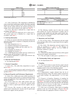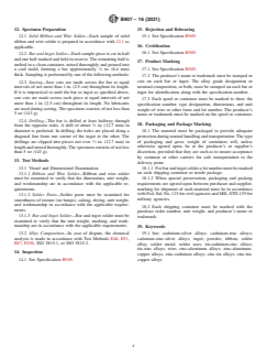 ASTM B907-16(2021) is a technical specification published by ASTM International. Its full title is "Standard Specification for Zinc, Tin and Cadmium Base Alloys Used as Solders". This standard covers: ABSTRACT This specification covers solder metal alloys used as solders for the purpose of joining together two or more metals at temperatures below their melting points. The solder alloy shall conform to the required chemical compositions of cadmium, zinc, tin, lead, antimony, silver, copper, aluminum, bismuth, arsenic, iron, nickel and magnesium. The solder paste shall conform to the required smoothness of textures, powder mesh size, and viscosity. SCOPE 1.1 This specification covers solder metal alloys (commonly known as soft solders), including zinc-aluminum, zinc-aluminum-copper, zinc-tin, zinc-tin-copper, zinc-cadmium-tin, zinc-cadmium, tin-zinc, cadmium-zinc, cadmium-zinc-silver, and cadmium-silver, used as solders for the purpose of joining together two or more metals at temperatures below their melting points. 1.1.1 Certain alloys specified in this standard are also used as Thermal Spray Wire in the electronics industry and are covered for this purpose in Specification B943. Specification B833 covers Zinc and Zinc Alloy Wire for Thermal Spraying (Metallizing) used primarily for the corrosion protection of steel (as noted in Annex A1 of this specification). 1.1.2 Tin base alloys are included in this specification because their use in the electronics industry is different than the major use of the tin and lead solder compositions specified in Specification B32. 1.1.3 These solders include alloys having a nominal liquidus temperature not exceeding 850°F (455°C). 1.1.4 This specification includes solder in the form of solid bars, ingots, wire, powder and special forms, and in the form of solder paste. 1.2 The values stated in inch-pound units are to be regarded as standard. The values given in parentheses are mathematical conversions to SI units that are provided for information only and are not considered standard. 1.3 Toxicity—Warning—Soluble and respirable forms of cadmium may be harmful to human health and the environment in certain forms and concentrations. Therefore, ingestion and inhalation of cadmium should be controlled under the appropriate regulations of the U.S. Occupational Safety and Health Administration (OSHA). Cadmium-containing alloys and coatings should not be used on articles that will contact food or beverages, or for dental and other equipment that is normally inserted in the mouth. Similarly, if articles using cadmium-containing alloys or coatings are welded, soldered, brazed, ground, flame-cut, or otherwise heated during fabrication, adequate ventilation must be provided to maintain occupational cadmium exposure below the OSHA Permissible Exposure Level (PEL). 1.4 This standard does not purport to address all of the safety concerns, if any, associated with its use. It is the responsibility of the user of this standard to become familiar with all hazards including those identified in the appropriate Safety Data Sheet (SDS) for this product/material as provided by the manufacturer, to establish appropriate safety, health, and environmental practices, and determine the applicability of regulatory limitations prior to use. 1.5 This international standard was developed in accordance with internationally recognized principles on standardization established in the Decision on Principles for the Development of International Standards, Guides and Recommendations issued by the World Trade Organization Technical Barriers to Trade (TBT) Committee.