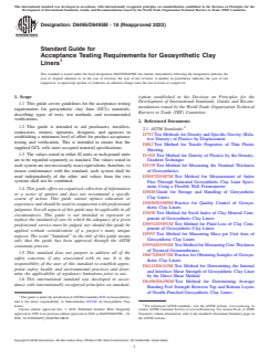 ASTM D6495/D6495M-18(2022) is a guide published by ASTM International. Its full title is "Standard Guide for Acceptance Testing Requirements for Geosynthetic Clay Liners". This standard covers: ABSTRACT This guide covers guidelines for the acceptance testing requirements for geosynthetic clay liner (GCL) materials, describing types of tests, test methods, and recommended verifications and is intended to aid purchasers, installers, contractors, owners, operators, designers and agencies in establishing a minimum level of effort for product acceptance testing and verification. This guide suggests the types of tests, the methods of the testing, and verification requirements for acceptance testing of GCL materials. It should be recognized that parties, organizations or representatives may perform additional tests and/or at other frequencies than required in this standard guide. In this case, the project-specific acceptance plan will then take precedence over this standard guide. Different properties such as clay mass per unit area, swell index, fluid loss, grab tensile strength, tensile strength, density and thickness of geomembrane support, and bonding peel strength shall be determined by subjecting the material to different test methods. SCOPE 1.1 This guide covers guidelines for the acceptance testing requirements for geosynthetic clay liner (GCL) materials, describing types of tests, test methods, and recommended verifications. 1.2 This guide is intended to aid purchasers, installers, contractors, owners, operators, designers, and agencies in establishing a minimum level of effort for product acceptance testing and verification. This is intended to ensure that the supplied GCL rolls meet accepted material specifications. 1.3 The values stated in either SI units or inch-pound units are to be regarded separately as standard. The values stated in each system are not necessarily exact equivalents; therefore, to ensure conformance with the standard, each system shall be used independently of the other, and values from the two systems shall not be combined. 1.4 This guide offers an organized collection of information or a series of options and does not recommend a specific course of action. This guide cannot replace education or experience and should be used in conjunction with professional judgment. Not all aspects of this guide may be applicable in all circumstances. This guide is not intended to represent or replace the standard of care by which the adequacy of a given professional service must be judged, nor should this guide be applied without consideration of a project's many unique aspects. The word “Standard” in the title of this guide means only that the guide has been approved through the ASTM consensus process. 1.5 This standard does not purport to address all of the safety concerns, if any, associated with its use. It is the responsibility of the user of this standard to establish appropriate safety, health, and environmental practices and determine the applicability of regulatory limitations prior to use. 1.6 This international standard was developed in accordance with internationally recognized principles on standardization established in the Decision on Principles for the Development of International Standards, Guides and Recommendations issued by the World Trade Organization Technical Barriers to Trade (TBT) Committee.