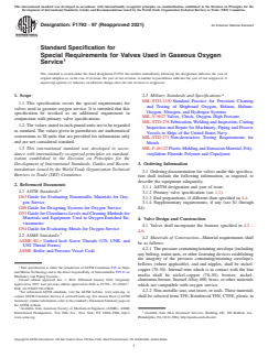 ASTM F1792-97(2021) is a technical specification published by ASTM International. Its full title is "Standard Specification for Special Requirements for Valves Used in Gaseous Oxygen Service". This standard covers: ABSTRACT This specification covers the special requirements for valves used in gaseous oxygen service. The pressure containing/retaining envelope, bellows, and end nipples, shall be made of nickel-copper alloy. Internal trim which is in contact with the line media shall either be made of nickel-copper alloy, bronze, nickel-aluminum-bronze, Inconel alloy 600, brass or other materials which are compatible with oxygen service. Non-metallic seat, seat insert, or seals shall be manufacture from either TFE, reinforced TFE, CTFE, plastic, polyamide, or PEEK. Materials for lubricants shall be halocarbon, Dupont, Barycote 601, or other lubricants compatible with oxygen service. Valves shall be constructed to minimize the possibility of initiating ignition in gaseous oxygen service. Valves shall be constructed to minimize oxygen escape in the event of an internal or external fire. This shall be accomplished by pressure-boundary sealing, internal seating and pressure surge. The manual valves shall be of the packless design, with the stem sealed by a bellows. SCOPE 1.1 This specification covers the special requirements for valves used in gaseous oxygen service. It is intended that this specification be invoked as an additional requirement in conjunction with primary valve specifications. 1.2 The values stated in inch-pound units are to be regarded as standard. The values given in parentheses are mathematical conversions to SI units that are provided for information only and are not considered standard. 1.3 This international standard was developed in accordance with internationally recognized principles on standardization established in the Decision on Principles for the Development of International Standards, Guides and Recommendations issued by the World Trade Organization Technical Barriers to Trade (TBT) Committee.