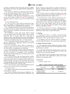 ABSTRACT This specification covers the special requirements for valves used in gaseous oxygen service. The pressure containing/retaining envelope, bellows, and end nipples, shall be made of nickel-copper alloy. Internal trim which is in contact with the line media shall either be made of nickel-copper alloy, bronze, nickel-aluminum-bronze, Inconel alloy 600, brass or other materials which are compatible with oxygen service. Non-metallic seat, seat insert, or seals shall be manufacture from either TFE, reinforced TFE, CTFE, plastic, polyamide, or PEEK. Materials for lubricants shall be halocarbon, Dupont, Barycote 601, or other lubricants compatible with oxygen service. Valves shall be constructed to minimize the possibility of initiating ignition in gaseous oxygen service. Valves shall be constructed to minimize oxygen escape in the event of an internal or external fire. This shall be accomplished by pressure-boundary sealing, internal seating and pressure surge. The manual valves shall be of the packless design, with the stem sealed by a bellows. SCOPE 1.1 This specification covers the special requirements for valves used in gaseous oxygen service. It is intended that this specification be invoked as an additional requirement in conjunction with primary valve specifications. 1.2 The values stated in inch-pound units are to be regarded as standard. The values given in parentheses are mathematical conversions to SI units that are provided for information only and are not considered standard. 1.3 This international standard was developed in accordance with internationally recognized principles on standardization established in the Decision on Principles for the Development of International Standards, Guides and Recommendations issued by the World Trade Organization Technical Barriers to Trade (TBT) Committee.
