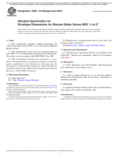 This specification supplies the standard envelope dimensions for small bronze globe valves of nominal pipe sizes from NPS ¼ to 2 with threaded and brazed end connections installed in shipboard piping systems. The valves are in accordance with MSS-SP80, Class 200.
