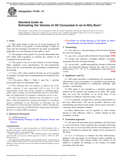 ASTM F3195-21 is a guide published by ASTM International. Its full title is "Standard Guide for Estimating the Volume of Oil Consumed in an In-Situ Burn". This standard covers: SIGNIFICANCE AND USE 4.1 This guide describes a methodology for estimating the effectiveness of an in-situ burn. It is intended to aid decision-makers and spill-responders in contingency planning, spill response, and training. 4.2 This guide is not intended as a detailed operational manual for the ignition and burning of oil slicks. The guide does not cover the feasibility of an in-situ burn, or the evaluation of airborne emissions from a burn. 4.3 It is generally accepted that a precise determination of the burn effectiveness will not be possible. However, the methodology presented in this guide can be used to provide a consistent and reasonable estimate. 4.4 Burn effectiveness can be reported as total volume burned or burn efficiency (that is, volume burned of that available), or both. SCOPE 1.1 This guide relates to the use of in-situ burning of oil spills. The focus of the guide is in-situ burning of spills on water, but the techniques described in the guide are generally applicable to in-situ burning of land spills as well. 1.2 The purpose of this guide is to provide information that will enable spill responders to estimate the volume of oil consumed in an in-situ burn. 1.3 This guide is one of several related to in-situ burning. Other standards cover specifications for fire-containment booms and the environmental and operational considerations for burning. 1.4 Units—The values stated in SI units are to be regarded as standard. No other units of measurement are included in this standard. 1.4.1 Exception—Table 1, Table 2 and Fig. 2 provide inch-pound units for information only. 1.5 This standard does not purport to address all of the safety concerns, if any, associated with its use. It is the responsibility of the user of this standard to establish appropriate safety, health, and environmental practices and determine the applicability of regulatory limitations prior to use. 1.6 This international standard was developed in accordance with internationally recognized principles on standardization established in the Decision on Principles for the Development of International Standards, Guides and Recommendations issued by the World Trade Organization Technical Barriers to Trade (TBT) Committee.