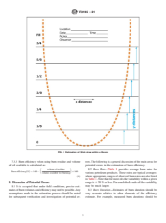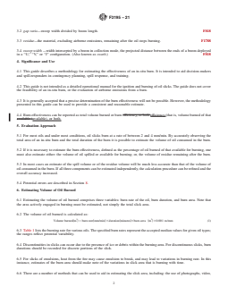 SIGNIFICANCE AND USE 4.1 This guide describes a methodology for estimating the effectiveness of an in-situ burn. It is intended to aid decision-makers and spill-responders in contingency planning, spill response, and training. 4.2 This guide is not intended as a detailed operational manual for the ignition and burning of oil slicks. The guide does not cover the feasibility of an in-situ burn, or the evaluation of airborne emissions from a burn. 4.3 It is generally accepted that a precise determination of the burn effectiveness will not be possible. However, the methodology presented in this guide can be used to provide a consistent and reasonable estimate. 4.4 Burn effectiveness can be reported as total volume burned or burn efficiency (that is, volume burned of that available), or both. SCOPE 1.1 This guide relates to the use of in-situ burning of oil spills. The focus of the guide is in-situ burning of spills on water, but the techniques described in the guide are generally applicable to in-situ burning of land spills as well. 1.2 The purpose of this guide is to provide information that will enable spill responders to estimate the volume of oil consumed in an in-situ burn. 1.3 This guide is one of several related to in-situ burning. Other standards cover specifications for fire-containment booms and the environmental and operational considerations for burning. 1.4 Units—The values stated in SI units are to be regarded as standard. No other units of measurement are included in this standard. 1.4.1 Exception—Table 1, Table 2 and Fig. 2 provide inch-pound units for information only. 1.5 This standard does not purport to address all of the safety concerns, if any, associated with its use. It is the responsibility of the user of this standard to establish appropriate safety, health, and environmental practices and determine the applicability of regulatory limitations prior to use. 1.6 This international standard was developed in accordance with internationally recognized principles on standardization established in the Decision on Principles for the Development of International Standards, Guides and Recommendations issued by the World Trade Organization Technical Barriers to Trade (TBT) Committee.
