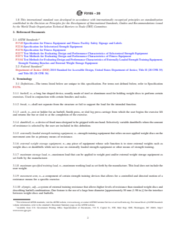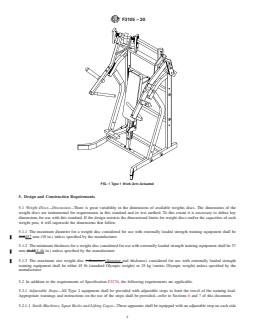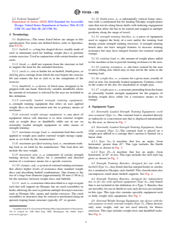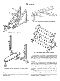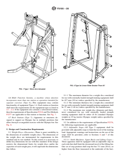 ABSTRACT This specification outlines parameters for the proper design and manufacture of externally loaded strength training equipment, strength training benches and external weight storage equipment. It aims to assist designers and manufacturers in reducing the possibility of injury when the products are used in accordance with the operational instructions. The fitness products are intended for use in an indoor setting or environment, and only by an individual age 13 and older. The equipment types covered by this specification are: externally loaded strength training equipment, work arm actuated (type 1); externally loaded strength training equipment, linear slide actuated (type 2); strength training benches, designed for use with a barbell (type 3); strength training benches, designed for independent use or for use with optional equipment (type 4); external weight storage equipment, any device with the sole purpose to store external weights (type 5); multi-function systems, a machine whose function incorporates more than one station or operation intended for separate exercises (type 6); rack stations (type 7). SCOPE 1.1 This specification establishes parameters for the design and manufacture of externally loaded strength training equipment, strength training benches and external weight storage equipment as defined in 3.1. 1.2 It is intended that these fitness products be used in an indoor setting or environment. 1.3 It is the intent of this standard to specify fitness products for use only by an individual age 13 and older. 1.4 This standard is to be used in conjunction with Specification F2276, Test Methods F2571, and Test Methods F3104. 1.5 This standard takes precedence over Specification F2276 and Test Methods F2571 in areas that are specific to Externally Loaded Strength Training Equipment, Strength Training Benches and External Weight Storage Equipment. 1.6 The values stated in SI units are to be regarded as standard. The values in parentheses are for information only. 1.7 This standard does not purport to address all of the safety concerns, if any, associated with its use. It is the responsibility of the user of this standard to establish appropriate safety, health, and environmental practices and determine the applicability of regulatory limitations prior to use. 1.8 This international standard was developed in accordance with internationally recognized principles on standardization established in the Decision on Principles for the Development of International Standards, Guides and Recommendations issued by the World Trade Organization Technical Barriers to Trade (TBT) Committee.