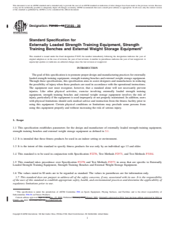 1.1 This specification establishes parameters for the design and manufacture of externally loaded strength training equipment, strength training benches and external weight storage equipment as defined in 3.1.