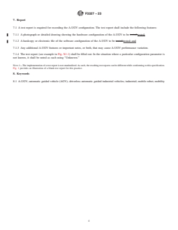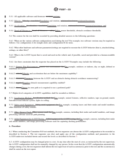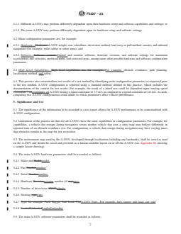 SIGNIFICANCE AND USE 5.1 The significance of the information to be recorded in a test report allows for A-UGV performance to be contextualized with A-UGV configuration. 5.2 Limitations of the practice are that not all A-UGVs have the same capabilities or configuration parameters. For example, for capabilities, a vehicle that remaps during navigation versus another vehicle that uses a static map may behave differently in repeated runs of an obstacle avoidance test. For configuration, a vehicle that remaps during navigation may have varying times that obstacles remain in the map for test recreation. 5.3 The environment map used by the A-UGV, developed through localization including any landmarks, shall be saved as used on the A-UGV and should be saved and provided as a human-readable layout on or off the A-UGV (see Appendix X1 showing a sample layout drawing). 5.4 The main A-UGV hardware parameters shall be recorded as follows: 5.4.1 Make and model; 5.4.2 Part number; 5.4.3 Serial number; 5.4.4 Hardware revision number (if any); 5.4.5 Number of drive/steer wheels; 5.4.6 Steering type; 5.4.7 A-UGV Type—For example, fork, tugger, unit load, cart; and 5.4.8 Loaded/unloaded. 5.5 The main A-UGV software parameters shall be recorded as follows: 5.5.1 All applicable software and firmware versions; 5.5.2 Velocity—Translation and rotation, minimum/maximum; 5.5.3 Acceleration—Translation and rotation, minimum/maximum; and 5.5.4 Stand-off Distances—Safety sensor thresholds, obstacle avoidance thresholds. 5.6 The context for the test shall be recorded by providing detailed answers to the following questions: 5.6.1 When are the various software configurations used during the test? For example, two software versions may be required as follows: Use configuration A for straight aisles and configuration B for turns. 5.6.2 What other hardware and software parameters/settings are required to recreate the A-UGV behavior (that is, attached debug, settin... SCOPE 1.1 This practice describes a means to record the Automatic, Automated, or Autonomous – Uncrewed Ground Vehicle (A-UGV) configuration when testing. The practice provides a method for recording A-UGV hardware and software control parameters and describes high-level capabilities, such as used for A-UGV safety and navigation. 1.2 This practice: contextualizes the A-UGV configuration during a test, including the identification and adjustment of main configuration parameters; provides the proper context for test results; provides a basis for comparison of the test circumstances across different vehicles or tests, or both; and allows a test to be recreated. 1.3 The values stated in SI units are to be regarded as the standard. The values given in parentheses are not precise mathematical conversions to imperial units. They are close approximate equivalents for the purpose of specifying A-UGV characteristics while maintaining repeatability and reproducibility of the test method results. These values given in parentheses are provided for information only and are not considered standard. 1.4 This standard does not purport to address all of the safety concerns, if any, associated with its use. It is the responsibility of the user of this standard to establish appropriate safety, health, and environmental practices and determine the applicability of regulatory limitations prior to use. 1.5 This international standard was developed in accordance with internationally recognized principles on standardization established in the Decision on Principles for the Development of International Standards, Guides and Recommendations issued by the World Trade Organization Technical Barriers to Trade (TBT) Committee.
