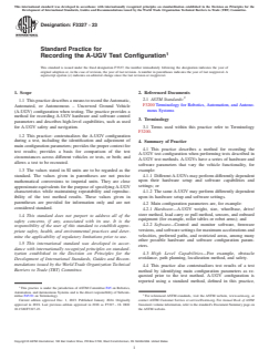 ASTM F3327-23 is a standard published by ASTM International. Its full title is "Standard Practice for Recording the A-UGV Test Configuration". This standard covers: SIGNIFICANCE AND USE 5.1 The significance of the information to be recorded in a test report allows for A-UGV performance to be contextualized with A-UGV configuration. 5.2 Limitations of the practice are that not all A-UGVs have the same capabilities or configuration parameters. For example, for capabilities, a vehicle that remaps during navigation versus another vehicle that uses a static map may behave differently in repeated runs of an obstacle avoidance test. For configuration, a vehicle that remaps during navigation may have varying times that obstacles remain in the map for test recreation. 5.3 The environment map used by the A-UGV, developed through localization including any landmarks, shall be saved as used on the A-UGV and should be saved and provided as a human-readable layout on or off the A-UGV (see Appendix X1 showing a sample layout drawing). 5.4 The main A-UGV hardware parameters shall be recorded as follows: 5.4.1 Make and model; 5.4.2 Part number; 5.4.3 Serial number; 5.4.4 Hardware revision number (if any); 5.4.5 Number of drive/steer wheels; 5.4.6 Steering type; 5.4.7 A-UGV Type—For example, fork, tugger, unit load, cart; and 5.4.8 Loaded/unloaded. 5.5 The main A-UGV software parameters shall be recorded as follows: 5.5.1 All applicable software and firmware versions; 5.5.2 Velocity—Translation and rotation, minimum/maximum; 5.5.3 Acceleration—Translation and rotation, minimum/maximum; and 5.5.4 Stand-off Distances—Safety sensor thresholds, obstacle avoidance thresholds. 5.6 The context for the test shall be recorded by providing detailed answers to the following questions: 5.6.1 When are the various software configurations used during the test? For example, two software versions may be required as follows: Use configuration A for straight aisles and configuration B for turns. 5.6.2 What other hardware and software parameters/settings are required to recreate the A-UGV behavior (that is, attached debug, settin... SCOPE 1.1 This practice describes a means to record the Automatic, Automated, or Autonomous – Uncrewed Ground Vehicle (A-UGV) configuration when testing. The practice provides a method for recording A-UGV hardware and software control parameters and describes high-level capabilities, such as used for A-UGV safety and navigation. 1.2 This practice: contextualizes the A-UGV configuration during a test, including the identification and adjustment of main configuration parameters; provides the proper context for test results; provides a basis for comparison of the test circumstances across different vehicles or tests, or both; and allows a test to be recreated. 1.3 The values stated in SI units are to be regarded as the standard. The values given in parentheses are not precise mathematical conversions to imperial units. They are close approximate equivalents for the purpose of specifying A-UGV characteristics while maintaining repeatability and reproducibility of the test method results. These values given in parentheses are provided for information only and are not considered standard. 1.4 This standard does not purport to address all of the safety concerns, if any, associated with its use. It is the responsibility of the user of this standard to establish appropriate safety, health, and environmental practices and determine the applicability of regulatory limitations prior to use. 1.5 This international standard was developed in accordance with internationally recognized principles on standardization established in the Decision on Principles for the Development of International Standards, Guides and Recommendations issued by the World Trade Organization Technical Barriers to Trade (TBT) Committee.