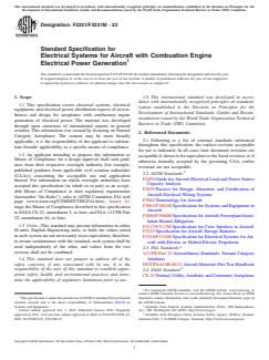 ASTM F3231/F3231M-23 is a technical specification published by ASTM International. Its full title is "Standard Specification for Electrical Systems for Aircraft with Combustion Engine Electrical Power Generation". This standard covers: ABSTRACT This specification applies to the electrical systems aspects of airworthiness and design for ”small” aircraft. It establishes the Aircraft Type Code (ATC) compliance matrix based on airworthiness level, number of engines, type of engine(s), stall speed, cruise speed, meteorological conditions, altitude, and maneuvers. An ATC is defined by taking into account both the technical considerations regarding the design of the aircraft and the airworthiness level established based upon risk-based criteria. The requirements established by this specification cover power source capacity and distribution, electrical systems and equipment, storage battery design and installation, circuit protective devices, master switch arrangement, switches, electrical cables and equipment, electrical system fire protection, and electronic equipment. SCOPE 1.1 This specification covers electrical systems, electrical equipment, and electrical power distribution aspects of airworthiness and design for aeroplanes with combustion engine generation of electrical power. The material was developed through open consensus of international experts in general aviation. This information was created by focusing on Normal Category Aeroplanes. The content may be more broadly applicable; it is the responsibility of the applicant to substantiate broader applicability as a specific means of compliance. 1.2 An applicant intending to propose this information as Means of Compliance for a design approval shall seek guidance from their respective oversight authority (for example, published guidance from applicable civil aviation authorities (CAAs)) concerning the acceptable use and application thereof. For information on which oversight authorities have accepted this specification (in whole or in part) as an acceptable Means of Compliance to their regulatory requirements (hereinafter “the Rules”), refer to ASTM Committee F44 web page (www.astm.org/COMMITTEE/F44.htm). Annex A1 maps the Means of Compliance described in this specification to EASA CS-23, amendment 5, or later, and FAA 14 CFR Part 23, amendment 64, or later. 1.3 Units—This standard may present information in either SI units, English Engineering units, or both; the values stated in each system are not necessarily exact equivalents; therefore, to ensure conformance with the standard, each system shall be used independently of the other, and values from the two systems shall not be combined. 1.4 This standard does not purport to address all of the safety concerns, if any, associated with its use. It is the responsibility of the user of this standard to establish appropriate safety, health, and environmental practices and determine the applicability of regulatory limitations prior to use. 1.5 This international standard was developed in accordance with internationally recognized principles on standardization established in the Decision on Principles for the Development of International Standards, Guides and Recommendations issued by the World Trade Organization Technical Barriers to Trade (TBT) Committee.
