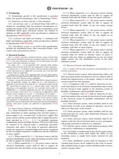 ABSTRACT This specification applies to the electrical systems aspects of airworthiness and design for ”small” aircraft. It establishes the Aircraft Type Code (ATC) compliance matrix based on airworthiness level, number of engines, type of engine(s), stall speed, cruise speed, meteorological conditions, altitude, and maneuvers. An ATC is defined by taking into account both the technical considerations regarding the design of the aircraft and the airworthiness level established based upon risk-based criteria. The requirements established by this specification cover power source capacity and distribution, electrical systems and equipment, storage battery design and installation, circuit protective devices, master switch arrangement, switches, electrical cables and equipment, electrical system fire protection, and electronic equipment. SCOPE 1.1 This specification covers electrical systems, electrical equipment, and electrical power distribution aspects of airworthiness and design for aeroplanes with combustion engine generation of electrical power. The material was developed through open consensus of international experts in general aviation. This information was created by focusing on Normal Category Aeroplanes. The content may be more broadly applicable; it is the responsibility of the applicant to substantiate broader applicability as a specific means of compliance. 1.2 An applicant intending to propose this information as Means of Compliance for a design approval shall seek guidance from their respective oversight authority (for example, published guidance from applicable civil aviation authorities (CAAs)) concerning the acceptable use and application thereof. For information on which oversight authorities have accepted this specification (in whole or in part) as an acceptable Means of Compliance to their regulatory requirements (hereinafter “the Rules”), refer to ASTM Committee F44 web page (www.astm.org/COMMITTEE/F44.htm). Annex A1 maps the Means of Compliance described in this specification to EASA CS-23, amendment 5, or later, and FAA 14 CFR Part 23, amendment 64, or later. 1.3 Units—This standard may present information in either SI units, English Engineering units, or both; the values stated in each system are not necessarily exact equivalents; therefore, to ensure conformance with the standard, each system shall be used independently of the other, and values from the two systems shall not be combined. 1.4 This standard does not purport to address all of the safety concerns, if any, associated with its use. It is the responsibility of the user of this standard to establish appropriate safety, health, and environmental practices and determine the applicability of regulatory limitations prior to use. 1.5 This international standard was developed in accordance with internationally recognized principles on standardization established in the Decision on Principles for the Development of International Standards, Guides and Recommendations issued by the World Trade Organization Technical Barriers to Trade (TBT) Committee.