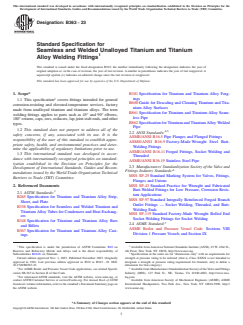 ASTM B363-23 is a technical specification published by ASTM International. Its full title is "Standard Specification for Seamless and Welded Unalloyed Titanium and Titanium Alloy Welding Fittings". This standard covers: ABSTRACT This specification covers fittings intended for general corrosion-resisting and elevated-temperature services, factory made from unalloyed titanium and titanium alloys. The titanium for welding fittings may consist of billets, bars, plates, seamless or welded pipe or tube that conforms to all the requirements for manufacturing process, testing, chemical composition, and mechanical properties. Forging, forming, or shaping operations may be performed by hammering, pressing, piercing, extruding, upsetting, rolling, bending, fusion welding, or by a combination of two or more of these operations. The titanium shall conform to the requirements as to prescribed chemical composition. Product analysis tolerances of aluminum, carbon, chromium, hydrogen, iron, molybdenum, nickel, niobium, nitrogen, oxygen, palladium, ruthenium, silicon, vanadium, zirconium, and some residuals shall be specified. The titanium shall conform to the requirements as to tensile properties prescribed in the specifications. SCOPE 1.1 This specification2 covers fittings intended for general corrosion-resisting and elevated-temperature services, factory made from unalloyed titanium and titanium alloys. The term welding fittings applies to parts such as 45° and 90° elbows, 180° returns, caps, tees, reducers, lap-joint stub ends, and other types. 1.2 This standard does not purport to address all of the safety concerns, if any, associated with its use. It is the responsibility of the user of this standard to establish appropriate safety, health, and environmental practices and determine the applicability of regulatory limitations prior to use. 1.3 This international standard was developed in accordance with internationally recognized principles on standardization established in the Decision on Principles for the Development of International Standards, Guides and Recommendations issued by the World Trade Organization Technical Barriers to Trade (TBT) Committee.