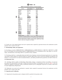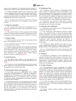 ABSTRACT This specification covers fittings intended for general corrosion-resisting and elevated-temperature services, factory made from unalloyed titanium and titanium alloys. The titanium for welding fittings may consist of billets, bars, plates, seamless or welded pipe or tube that conforms to all the requirements for manufacturing process, testing, chemical composition, and mechanical properties. Forging, forming, or shaping operations may be performed by hammering, pressing, piercing, extruding, upsetting, rolling, bending, fusion welding, or by a combination of two or more of these operations. The titanium shall conform to the requirements as to prescribed chemical composition. Product analysis tolerances of aluminum, carbon, chromium, hydrogen, iron, molybdenum, nickel, niobium, nitrogen, oxygen, palladium, ruthenium, silicon, vanadium, zirconium, and some residuals shall be specified. The titanium shall conform to the requirements as to tensile properties prescribed in the specifications. SCOPE 1.1 This specification2 covers fittings intended for general corrosion-resisting and elevated-temperature services, factory made from unalloyed titanium and titanium alloys. The term welding fittings applies to parts such as 45° and 90° elbows, 180° returns, caps, tees, reducers, lap-joint stub ends, and other types. 1.2 This standard does not purport to address all of the safety concerns, if any, associated with its use. It is the responsibility of the user of this standard to establish appropriate safety, health, and environmental practices and determine the applicability of regulatory limitations prior to use. 1.3 This international standard was developed in accordance with internationally recognized principles on standardization established in the Decision on Principles for the Development of International Standards, Guides and Recommendations issued by the World Trade Organization Technical Barriers to Trade (TBT) Committee.