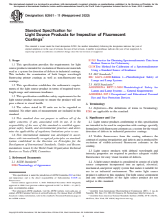 ASTM E2501-11(2022), Standard Specification for Light Source Products for Inspection of Fluorescent Coatings, establishes critical requirements for light sources used in the inspection of industrial coatings incorporating fluorescent materials. Developed by ASTM International, this standard ensures that these light source products are suitable for the excitation of fluorescent coatings, facilitating the detection of surface defects and irregularities in protective coatings used across various industries. It specifies essential parameters related to radiometric performance, safety, and proper testing to guarantee effective and safe use in industrial environments.
