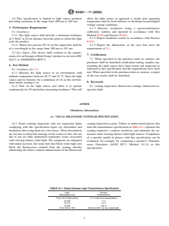 ASTM E2501-11(2022) is a technical specification published by ASTM International. Its full title is "Standard Specification for Light Source Products for Inspection of Fluorescent Coatings". This standard covers: ABSTRACT This specification provides the requirements for light source products intended for excitation of fluorescent materials used as a system for detection of defects in industrial coatings. This includes the examination of both longer wavelength fluorescing primer coatings as well as non-fluorescent top coatings. Also, this specification establishes the radiometric requirements of the light source product in terms of required wavelength range and minimum irradiance. Safety requirements shall be established for the light source product necessary to ensure the product will not pose a threat to visual health. Irradiance test method shall be performed to conform to the specified requirements, in accordance to the test method. SIGNIFICANCE AND USE 4.1 Light source products conforming to this specification are intended to be used in conjunction with coatings specially formulated with fluorescent colorants as a system for the visual detection of defects in industrial protective coatings. 4.2 Visible fluorescence from the coating enhances the contrast of coating irregularities and defects and is produced by excitation of visible-activated fluorescent colorants in the coating. 4.3 Light source products with defined wavelength and intensity properties are required to produce adequate visible fluorescence for easy visual location of defects. 4.4 A light source product is considered to consist of a light source component incorporated into an optical, electrical, mechanical, and power supply system that makes it suitable for use in an industrial environment. The entire light source product is subject to this standard. The light source component and any subassemblies of the light source product are not subject to this standard. 4.5 This specification is limited to light source products providing excitation in the range from 400 nm to 420 nm. SCOPE 1.1 This specification provides the requirements for light source products intended for excitation of fluorescent materials used as a system for detection of defects in industrial coatings. This includes the examination of both longer wavelength fluorescing primer coatings as well as non-fluorescent top coatings. 1.2 This specification establishes the radiometric requirements of the light source product in terms of required wavelength range and minimum irradiance. 1.3 This specification establishes safety requirements for the light source product necessary to ensure the product will not pose a threat to visual health. 1.4 The values stated in SI units are to be regarded as standard. No other units of measurement are included in this standard. 1.5 This standard does not purport to address all of the safety concerns, if any, associated with its use. It is the responsibility of the user of this standard to establish appropriate safety, health, and environmental practices and determine the applicability of regulatory limitations prior to use. 1.6 This international standard was developed in accordance with internationally recognized principles on standardization established in the Decision on Principles for the Development of International Standards, Guides and Recommendations issued by the World Trade Organization Technical Barriers to Trade (TBT) Committee.