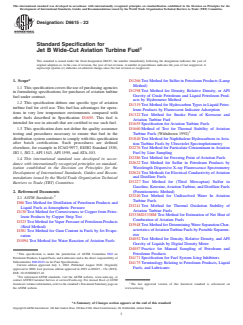 ASTM D6615-22: Standard Specification for Jet B Wide-Cut Aviation Turbine Fuel is a comprehensive international standard published by ASTM. It sets forth requirements for Jet B wide-cut aviation turbine fuel, focusing on its composition, properties, performance characteristics, and approved additives. Jet B fuel is intended specifically for civil aviation and is recognized for its suitability in very low temperature environments, making it especially valuable for operations in cold climates where kerosene-type fuels may be less effective. This specification supports agencies and organizations in purchasing and supplying high-quality aviation turbine fuel under contractual agreements.