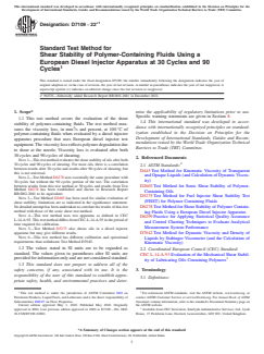 ASTM D7109-22e1 is a standard published by ASTM International. Its full title is "Standard Test Method for Shear Stability of Polymer-Containing Fluids Using a European Diesel Injector Apparatus at 30 Cycles and 90 Cycles". This standard covers: SIGNIFICANCE AND USE 5.1 This test method evaluates the percent viscosity loss of fluids resulting from physical degradation in the high shear nozzle device. Thermal or oxidative effects are minimized. 5.2 This test method may be used for quality control purposes by manufacturers of polymeric lubricant additives and their customers. 5.3 This test method is not intended to predict viscosity loss in field service in different field equipment under widely varying operating conditions, which may cause lubricant viscosity to change due to thermal and oxidative changes, as well as by the mechanical shearing of polymer. However, when the field service conditions, primarily or exclusively, result in the degradation of polymer by mechanical shearing, there may be a correlation between the results from this test method and results from the field. SCOPE 1.1 This test method covers the evaluation of the shear stability of polymer-containing fluids. The test method measures the viscosity loss, in mm2/s and percent, at 100 °C of polymer-containing fluids when evaluated by a diesel injector apparatus procedure that uses European diesel injector test equipment. The viscosity loss reflects polymer degradation due to shear at the nozzle. Viscosity loss is evaluated after both 30 cycles and 90 cycles of shearing. Note 1: This test method evaluates the shear stability of oils after both 30 cycles and 90 cycles of shearing. For most oils, there is a correlation between results after 30 cycles and results after 90 cycles of shearing, but this is not universal. Note 2: Test Method D6278 uses essentially the same procedure with 30 cycles but without the 90 cycles portion of the test. The correlation between results from this test method at 30 cycles and results from Test Method D6278 has been established and shown in Research Report RR:D02-1629 to be equivalent. Note 3: Test Method D2603 has been used for similar evaluation of shear stability; limitations are as indicated in the significance statement. No detailed attempt has been undertaken to correlate the results of this test method with those of the sonic shear test method. Note 4: This test method uses test apparatus as defined in CEC L-14-A-93. This test method differs from CEC-L-14-A-93 in the period of time required for calibration. Note 5: Test Method D5275 also shears oils in a diesel injector apparatus but may give different results. Note 6: This test method has different calibration and operational requirements than withdrawn Test Method D3945. 1.2 The values stated in SI units are to be regarded as standard. The values given in parentheses after SI units are provided for information only and are not considered standard. 1.3 This standard does not purport to address all of the safety concerns, if any, associated with its use. It is the responsibility of the user of this standard to establish appropriate safety, health, and environmental practices and determine the applicability of regulatory limitations prior to use. Specific warning statements are given in Section 8. 1.4 This international standard was developed in accordance with internationally recognized principles on standardization established in the Decision on Principles for the Development of International Standards, Guides and Recommendations issued by the World Trade Organization Technical Barriers to Trade (TBT) Committee.