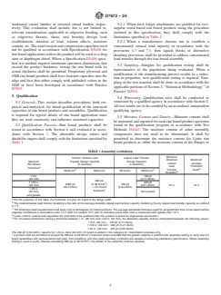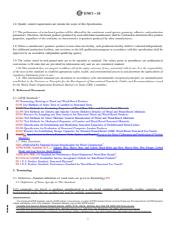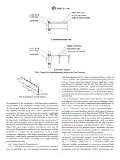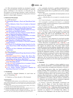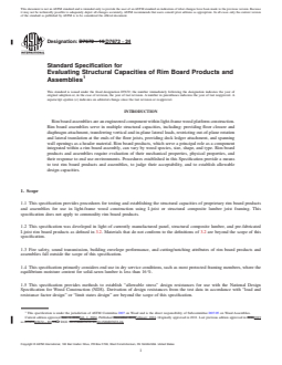 ABSTRACT This specification provides procedures for testing and establishing the structural capacities of proprietary rim board products and assemblies for use in light-frame wood construction using I-joist or structural composite lumber joist framing. This specification also establishes several procedures used to test rim board products and assemblies, to judge their acceptability, and to establish allowable design capacities. SCOPE 1.1 This specification provides procedures for testing and establishing the structural capacities of proprietary rim board products and assemblies for use in light-frame wood construction using I-joist or structural composite lumber joist framing. This specification does not apply to commodity rim board products. 1.2 This specification was developed in light of currently manufactured panel, structural composite lumber, and pre-fabricated I-joist rim board products as defined in 3.2. Materials that do not conform to the definitions of 3.2 are beyond the scope of this specification. 1.3 Fire safety, sound transmission, building envelope performance, and cutting/notching attributes of rim board products and assemblies fall outside the scope of this specification. 1.4 This specification primarily considers end use in dry service conditions, such as most protected framing members, where the equilibrium moisture content for solid-sawn lumber is less than 16 %. 1.5 This specification provides methods to establish “allowable stress” design resistances for use with the National Design Specification for Wood Construction (NDS). Derivation of design resistances from the test data in accordance with “load and resistance factor design” or “limit states design” are beyond the scope of this specification. 1.6 Quality control requirements are outside the scope of this Specification. 1.7 The performance of a rim board product will be affected by the constituent wood species, geometry, adhesive, and production parameters. Therefore, rim board products produced by each individual manufacturer shall be evaluated to determine their product properties, regardless of the similarity in characteristics to products produced by other manufacturers. 1.8 Where a manufacturer produces product in more than one facility, each production facility shall be evaluated independently. For additional production facilities, any revisions to the full qualification program in accordance with this specification shall be approved by an accredited, independent qualifying agency. 1.9 The values stated in inch-pound units are to be regarded as standard. The values given in parentheses are mathematical conversions to SI units that are provided for information only and are not considered standard. 1.10 This standard does not purport to address all of the safety concerns, if any, associated with its use. It is the responsibility of the user of this standard to establish appropriate safety, health, and environmental practices and determine the applicability of regulatory limitations prior to use. 1.11 This international standard was developed in accordance with internationally recognized principles on standardization established in the Decision on Principles for the Development of International Standards, Guides and Recommendations issued by the World Trade Organization Technical Barriers to Trade (TBT) Committee.