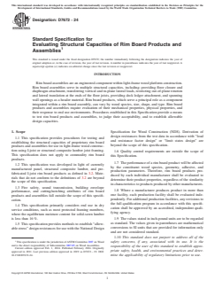 ASTM D7672-24 is a technical specification published by ASTM International. Its full title is "Standard Specification for Evaluating Structural Capacities of Rim Board Products and Assemblies". This standard covers: ABSTRACT This specification provides procedures for testing and establishing the structural capacities of proprietary rim board products and assemblies for use in light-frame wood construction using I-joist or structural composite lumber joist framing. This specification also establishes several procedures used to test rim board products and assemblies, to judge their acceptability, and to establish allowable design capacities. SCOPE 1.1 This specification provides procedures for testing and establishing the structural capacities of proprietary rim board products and assemblies for use in light-frame wood construction using I-joist or structural composite lumber joist framing. This specification does not apply to commodity rim board products. 1.2 This specification was developed in light of currently manufactured panel, structural composite lumber, and pre-fabricated I-joist rim board products as defined in 3.2. Materials that do not conform to the definitions of 3.2 are beyond the scope of this specification. 1.3 Fire safety, sound transmission, building envelope performance, and cutting/notching attributes of rim board products and assemblies fall outside the scope of this specification. 1.4 This specification primarily considers end use in dry service conditions, such as most protected framing members, where the equilibrium moisture content for solid-sawn lumber is less than 16 %. 1.5 This specification provides methods to establish “allowable stress” design resistances for use with the National Design Specification for Wood Construction (NDS). Derivation of design resistances from the test data in accordance with “load and resistance factor design” or “limit states design” are beyond the scope of this specification. 1.6 Quality control requirements are outside the scope of this Specification. 1.7 The performance of a rim board product will be affected by the constituent wood species, geometry, adhesive, and production parameters. Therefore, rim board products produced by each individual manufacturer shall be evaluated to determine their product properties, regardless of the similarity in characteristics to products produced by other manufacturers. 1.8 Where a manufacturer produces product in more than one facility, each production facility shall be evaluated independently. For additional production facilities, any revisions to the full qualification program in accordance with this specification shall be approved by an accredited, independent qualifying agency. 1.9 The values stated in inch-pound units are to be regarded as standard. The values given in parentheses are mathematical conversions to SI units that are provided for information only and are not considered standard. 1.10 This standard does not purport to address all of the safety concerns, if any, associated with its use. It is the responsibility of the user of this standard to establish appropriate safety, health, and environmental practices and determine the applicability of regulatory limitations prior to use. 1.11 This international standard was developed in accordance with internationally recognized principles on standardization established in the Decision on Principles for the Development of International Standards, Guides and Recommendations issued by the World Trade Organization Technical Barriers to Trade (TBT) Committee.