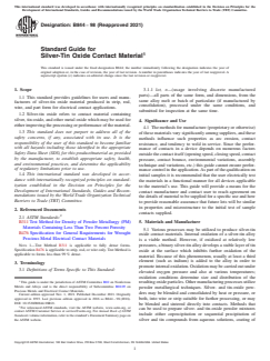 SIGNIFICANCE AND USE 4.1 The methods for manufacture (proprietary or otherwise) of these materials vary significantly among suppliers, and these methods influence such properties as arc erosion, contact resistance, and tendency to weld in service. Since the performance of contacts in a device depends on numerous factors outside the contact itself (opening speed, closing speed, contact pressure, contact bounce, environmental variations, assembly technique and variations, etc.) this guide cannot ensure performance control in the application. As part of the qualification on initial samples it is recommended that the user electrically test the materials in a functional manner for all devices applicable to the material’s use. This guide will provide a means for the contact manufacturer and contact user to reach agreement on the details of material to be supplied for a specific use and how to provide reasonable assurance that future lots will be similar in properties and microstructure to the initial test of sample contacts supplied. SCOPE 1.1 This standard provides guidelines for users and manufacturers of silver-tin oxide material produced in strip, rod, wire, and part form for electrical contact applications. 1.2 Silver-tin oxide refers to contact material containing silver, tin oxide, and other metal oxide which may be used for either improving the processing or performance of the material. 1.3 This standard does not purport to address all of the safety concerns, if any, associated with its use. It is the responsibility of the user of this standard to become familiar with all hazards including those identified in the appropriate Safety Data Sheet (SDS) for this product/material as provided by the manufacturer, to establish appropriate safety, health, and environmental practices, and determine the applicability of regulatory limitations prior to use. 1.4 This international standard was developed in accordance with internationally recognized principles on standardization established in the Decision on Principles for the Development of International Standards, Guides and Recommendations issued by the World Trade Organization Technical Barriers to Trade (TBT) Committee.