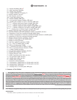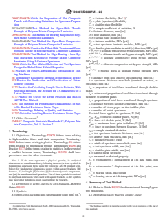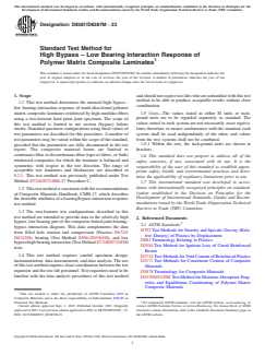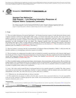 SIGNIFICANCE AND USE 5.1 Refer to Guide D8509. SCOPE 1.1 This test method determines the uniaxial high bypass - low bearing interaction response of multi-directional polymer matrix composite laminates reinforced by high-modulus fibers using a two-fastener hard point joint specimen. The scope of this test method is limited to net section (bypass) failure modes. Standard specimen configurations using fixed values of test parameters are described for this procedure. A number of test parameters may be varied within the scope of the standard, provided that the parameters are fully documented in the test report. The composite material forms are limited to continuous-fiber or discontinuous-fiber (tape or fabric, or both) reinforced composites for which the laminate is balanced and symmetric with respect to the test direction. The range of acceptable test laminates and thicknesses are described in 8.2.1. This test method was previously published under Test Method D7248/D7248M-17 Procedure C. 1.2 This test method is consistent with the recommendations of Composite Materials Handbook, CMH-17, which describes the desirable attributes of a bearing/bypass interaction response test method. 1.3 The two-fastener test configurations described in this test method are intended to provide data in the relatively high bypass, low bearing part of the composite bolted joint bearing-bypass interaction diagram. This data complements the data from filled hole tension and compression (Practice D6742/D6742M), bearing (Test Method D5961/D5961M), and low bypass/high bearing interaction (Test Method D7248/D7248M) tests. 1.4 This test method requires careful specimen design, instrumentation, data measurement, and data analysis. The use of this test method requires close coordination between the test requestor and the test lab personnel. Test requestors need to be familiar with the data analysis procedures of this test method and should not expect test labs who are unfamiliar with this test method to be able to produce acceptable results without close coordination. 1.5 Units—The values stated in either SI units or inch-pound units are to be regarded separately as standard. The values stated in each system are not necessarily exact equivalents; therefore, to ensure conformance with the standard, each system shall be used independently of the other, and values from the two systems shall not be combined. 1.5.1 Within the text, the inch-pound units are shown in brackets. 1.6 This standard does not purport to address all of the safety concerns, if any, associated with its use. It is the responsibility of the user of this standard to establish appropriate safety, health, and environmental practices and determine the applicability of regulatory limitations prior to use. 1.7 This international standard was developed in accordance with internationally recognized principles on standardization established in the Decision on Principles for the Development of International Standards, Guides and Recommendations issued by the World Trade Organization Technical Barriers to Trade (TBT) Committee.