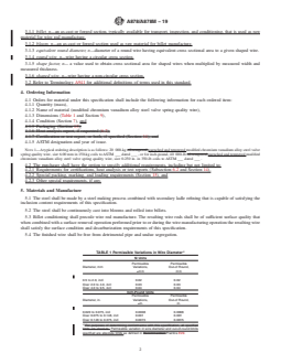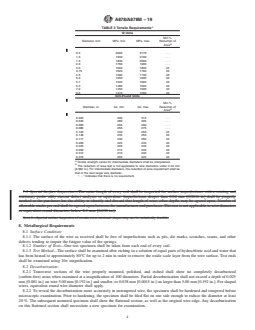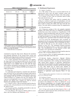 ABSTRACT This specification covers the highest quality of round modified chromium vanadium alloy steel valve spring wires, uniform in quality and temper, intended for the manufacture of valve springs and other springs requiring high-fatigue properties when used at moderately elevated temperatures. This wire shall either be in the annealed and cold-drawn or oil-tempered condition. The steel shall be subjected to continuous casting and be free from detrimental pipe and undue segregation. Heat and product analysis shall conform to the chemical requirements for carbon, manganese, phosphorus, sulfur, silicon, chromium, and vanadium. Mechanical properties shall be determined by the following: annealing and cold-drawing, oil tempering, wrap testing, and special surface inspection. In the oil-tempered condition, steel shall conform to the tensile requirements for different wire diameters. Metallurgical characterization shall include surface condition, decarburization, and inclusion content. The wire or wire rod shall conform to the maximum inclusion content requirements for the surface and core zones. SCOPE 1.1 This specification covers the highest quality of round and shaped modified chromium vanadium alloy steel valve spring wire, uniform in quality and temper, intended for the manufacture of valve springs and other springs requiring high-fatigue properties when used at moderately elevated temperatures. It is similar to the grade VD (referenced in EN 10270-2) intended for high fatigue levels. This wire shall be either in the annealed and cold-drawn or quenched and tempered condition as specified by purchaser. 1.2 The values stated in either SI units or inch-pound units are to be regarded separately as standard. Within the text, the inch-pound units are shown in brackets. The values stated in each system are not exact equivalents; therefore, each system shall be used independent of the other. Combining values from the two systems may result in non-conformance with the standard. 1.3 This international standard was developed in accordance with internationally recognized principles on standardization established in the Decision on Principles for the Development of International Standards, Guides and Recommendations issued by the World Trade Organization Technical Barriers to Trade (TBT) Committee.