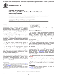 ASTM D1264-18e1 is a standard published by ASTM International. Its full title is "Standard Test Method for Determining the Water Washout Characteristics of Lubricating Greases". This standard covers: SIGNIFICANCE AND USE 4.1 This test method estimates the resistance of greases to water washout from ball bearings under conditions of the test. No correlation with field service has been established. SCOPE 1.1 This test method covers the evaluation of the resistance of a lubricating grease to washout by water from a bearing, when tested at 38 °C and 79 °C (100 °F and 175 °F) under the prescribed laboratory conditions. It is not to be considered the equivalent of service evaluation tests. Precision and bias was determined using grease ranging from NLGI 3 to 0 grades in the research report (see Section 10). 1.2 This test method may not be suitable for some greases containing highly volatile components. This test method does not attempt to account for sample evaporation. It is the user's responsibility to determine if evaporation of the sample is a significant contributor to mass loss at the required drying temperature. 1.3 The values stated in SI units are to be regarded as standard. The values given in parentheses after SI units are provided for information only and are not considered standard. 1.4 This standard does not purport to address all of the safety concerns, if any, associated with its use. It is the responsibility of the user of this standard to establish appropriate safety, health, and environmental practices and determine the applicability of regulatory limitations prior to use. For specific warning statements, see 6.3. 1.5 This international standard was developed in accordance with internationally recognized principles on standardization established in the Decision on Principles for the Development of International Standards, Guides and Recommendations issued by the World Trade Organization Technical Barriers to Trade (TBT) Committee.