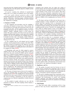 SIGNIFICANCE AND USE 5.1 The quality of ground water has become an issue of national concern. Ground-water monitoring wells are one of the more important tools for evaluating the quality of ground water, delineating contamination plumes, and establishing the integrity of hazardous material management facilities. 5.2 The goal in sampling ground-water monitoring wells is to obtain samples that meet the DQOs. This guide discusses the advantages and disadvantages of various well sampling methods, equipment, and sample preservation techniques. It reviews the variables that need to be considered in developing a valid sampling plan. SCOPE 1.1 This guide covers sampling equipment and procedures and “in the field” preservation, and it does not include well location, depth, well development, design and construction, screening, or analytical procedures that also have a significant bearing on sampling results. This guide is intended to assist a knowledgeable professional in the selection of equipment for obtaining representative samples from ground-water monitoring wells that are compatible with the formations being sampled, the site hydrogeology, and the end use of the data. 1.2 This guide is only intended to provide a review of many of the most commonly used methods for collecting ground-water quality samples from monitoring wells and is not intended to serve as a ground-water monitoring plan for any specific application. Because of the large and ever increasing number of options available, no single guide can be viewed as comprehensive. The practitioner must make every effort to ensure that the methods used, whether or not they are addressed in this guide, are adequate to satisfy the monitoring objectives at each site. 1.3 The values stated in SI units are to be regarded as standard. The values given in parentheses are provided for information only. 1.4 This standard does not purport to address all of the safety concerns, if any, associated with its use. It is the responsibility of the user of this standard to establish appropriate safety, health, and environmental practices and determine the applicability of regulatory limitations prior to use. 1.5 This international standard was developed in accordance with internationally recognized principles on standardization established in the Decision on Principles for the Development of International Standards, Guides and Recommendations issued by the World Trade Organization Technical Barriers to Trade (TBT) Committee.