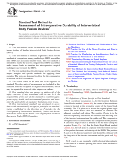 ASTM F3631-24 is a standard published by ASTM International. Its full title is "Standard Test Method for Assessment of Intra-operative Durability of Intervertebral Body Fusion Devices". This standard covers: SIGNIFICANCE AND USE 5.1 IBFDs can be single-piece or multicomponent designs and can be porous or hollow in nature. Their function is to support the anterior column of the spine to facilitate arthrodesis of the motion segment. 5.2 Intra-operative IBFD assembly failures can result in significant clinical consequences.4 This test method outlines materials and methods for the comparative characterization and evaluation of the intra-operative impact performance of IBFD assemblies. 5.3 The impact forces applied during a surgical procedure may be highly variable and, therefore, the results from these tests may not directly predict in vivo performance. The results, however, can be used to compare mechanical performance of different IBFD assemblies. The tests may also identify the weakest, most likely to fail points in particular IBFD-inserter combinations, thus enabling design improvements. 5.4 Intra-operative clinical failures may be due to several factors, some of which may not be simulated in the current method. For example, off-axis impact loads applied to the IBFD assembly are not simulated in the current method yet may contribute to intra-operative clinical failures in some designs. The user of this standard should consider incorporating such factors into their evaluations. SCOPE 1.1 This test method covers the materials and methods for impact testing of lumbar intervertebral body fusion devices (IBFD). 1.2 This test method is intended to provide a basis for the mechanical comparison among nonbiologic IBFD assemblies (the IBFD and associated inserter tool). This test method is intended to enable the user to compare these IBFD assemblies under impact loads to simulate the intra-operative surgical technique used to insert the IBFD. 1.3 The test method describes the impact test by specifying impact energies and specific methods for applying these energies. The tests are designed to allow for the comparative evaluation of IBFD assemblies. 1.4 The values stated in SI units are to be regarded as standard. No other units of measurement are included in this standard, with the exception of angular measurements, which may be reported in terms of either degrees or radians. 1.5 This standard does not purport to address all of the safety concerns, if any, associated with its use. It is the responsibility of the user of this standard to establish appropriate safety, health, and environmental practices and determine the applicability of regulatory limitations prior to use. 1.6 This international standard was developed in accordance with internationally recognized principles on standardization established in the Decision on Principles for the Development of International Standards, Guides and Recommendations issued by the World Trade Organization Technical Barriers to Trade (TBT) Committee.