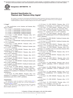 ASTM B977/B977M-19: Standard Specification for Titanium and Titanium Alloy Ingots is a key international standard developed by ASTM International, covering the requirements for titanium and titanium alloy ingots. This specification outlines essential parameters such as chemical composition, permissible variations in product analysis, ordering information, and required manufacturing and packaging practices for ingots produced for further processing into a variety of mill products. The standard applies to a broad range of grades, ensuring high-quality, consistent titanium materials for critical applications.