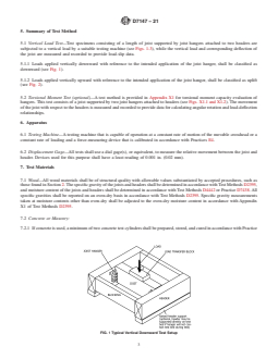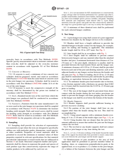 ABSTRACT This specification covers a procedure for evaluating metal devices used for wood-to-wood, wood-to-concrete, wood-to-concrete masonry, and wood-to-steel joist, beam, and girder connections. It describes test methods for evaluating the capacities of joist hangers subject to vertical and torsional loading. Also, this specification provides a method of assigning allowable loads to joist hangers based on measured strength and deformation characteristics. Test specimens consisting of a length of joist supported by joist hangers attached to two headers are subjected to a vertical load by a suitable testing machine, while the vertical load and corresponding deflection of the joist are measured and recorded to provide load-slip data. SCOPE 1.1 This specification covers a procedure for evaluating metal devices used for wood-to-wood, wood-to-concrete, wood-to-concrete masonry, and wood-to-steel connections. This method is intended for use with devices used to connect joists, beams, and girders together. These devices are commonly described as joist hangers. 1.2 This specification describes test methods for evaluating the capacities of joist hangers subject to vertical and torsional loading. 1.3 This specification provides a method of assigning allowable loads to joist hangers based on measured strength and deformation characteristics. Information obtained by the provisions of this specification is applicable to design when using the Allowable Stress Design method. 1.4 Units—The values stated in inch-pound units are to be regarded as standard. The values given in parentheses are mathematical conversions to SI units that are provided for information only and are not considered standard. 1.5 This standard does not purport to address all of the safety concerns, if any, associated with its use. It is the responsibility of the user of this standard to establish appropriate safety, health, and environmental practices and determine the applicability of regulatory limitations prior to use. 1.6 This international standard was developed in accordance with internationally recognized principles on standardization established in the Decision on Principles for the Development of International Standards, Guides and Recommendations issued by the World Trade Organization Technical Barriers to Trade (TBT) Committee.