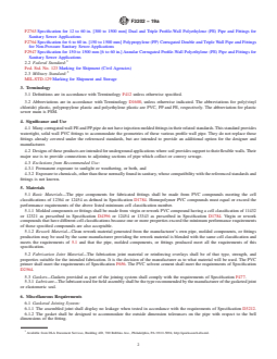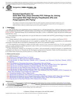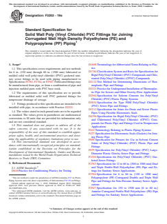 ASTM F3202-19a is a technical specification published by ASTM International. Its full title is "Standard Specification for Solid Wall Poly (Vinyl Chloride) PVC Fittings for Joining Corrugated Wall High Density Polyethylene (PE) and Polypropylene (PP) Piping". This standard covers: SCOPE 1.1 This specification covers requirements and test methods for 6 in. (150 mm) through 60 in. (1500 mm) fabricated or molded solid wall poly(vinyl chloride) (PVC) gasketed sanitary sewer fittings to be used with piping manufactured to Specifications F2763, F2764, or F2947. Fabricated fittings may be manufactured from pipe, or from a combination of pipe and injection molded parts with PVC base stock. 1.2 The requirements of this specification are to provide fabricated or molded solid wall PVC gasketed fittings for nonpressure drainage of sewage. 1.3 Fittings produced to this specification are intended to be installed with pipe, in accordance with Practice D2321. 1.4 The values stated in inch-pound units are to be regarded as standard. The values given in parentheses are mathematical conversions to SI units that are provided for information only and are not considered standard. 1.5 This standard does not purport to address all of the safety concerns, if any, associated with its use. It is the responsibility of the user of this standard to establish appropriate safety, health, and environmental practices and determine the applicability of regulatory limitations prior to use. 1.6 This international standard was developed in accordance with internationally recognized principles on standardization established in the Decision on Principles for the Development of International Standards, Guides and Recommendations issued by the World Trade Organization Technical Barriers to Trade (TBT) Committee.