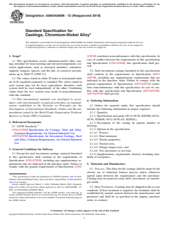 ASTM A560/A560M-12(2018): Standard Specification for Castings, Chromium-Nickel Alloy is an international standard developed by ASTM International to provide requirements for chromium-nickel alloy castings intended for heat-resisting and elevated-temperature corrosion applications. This standard is essential for manufacturers, suppliers, and users of alloy castings used in corrosive and high-temperature environments, including structural members, containers, supports, hangers, and spacers.